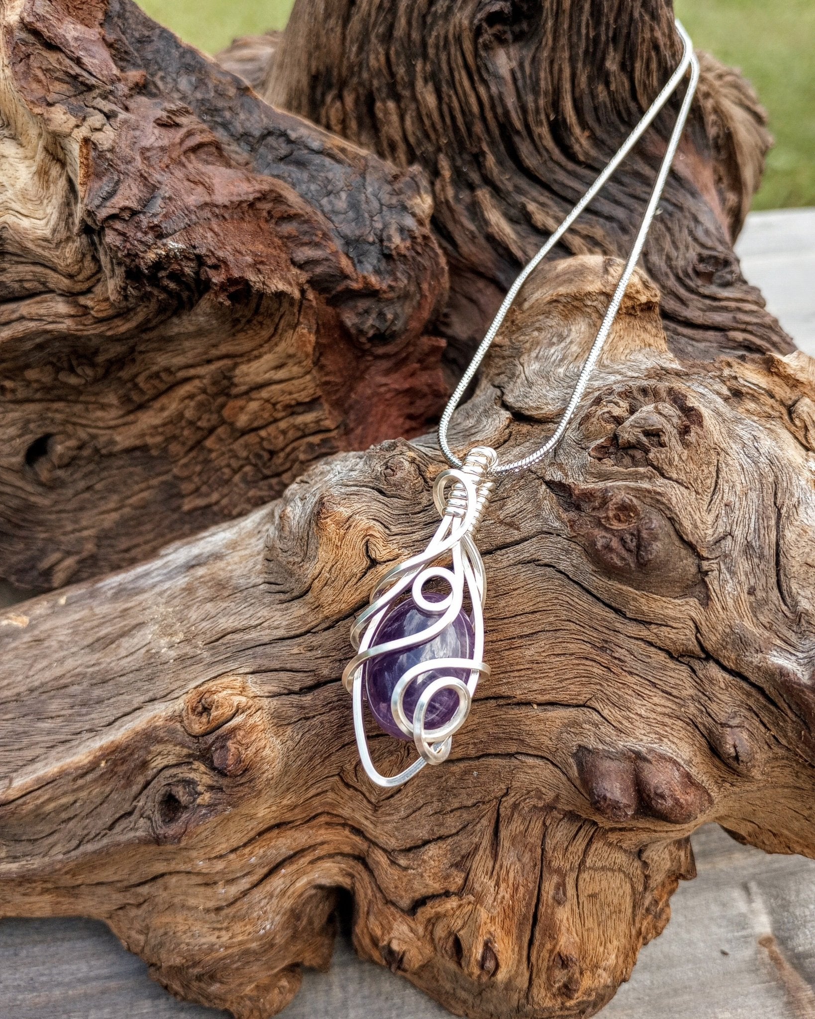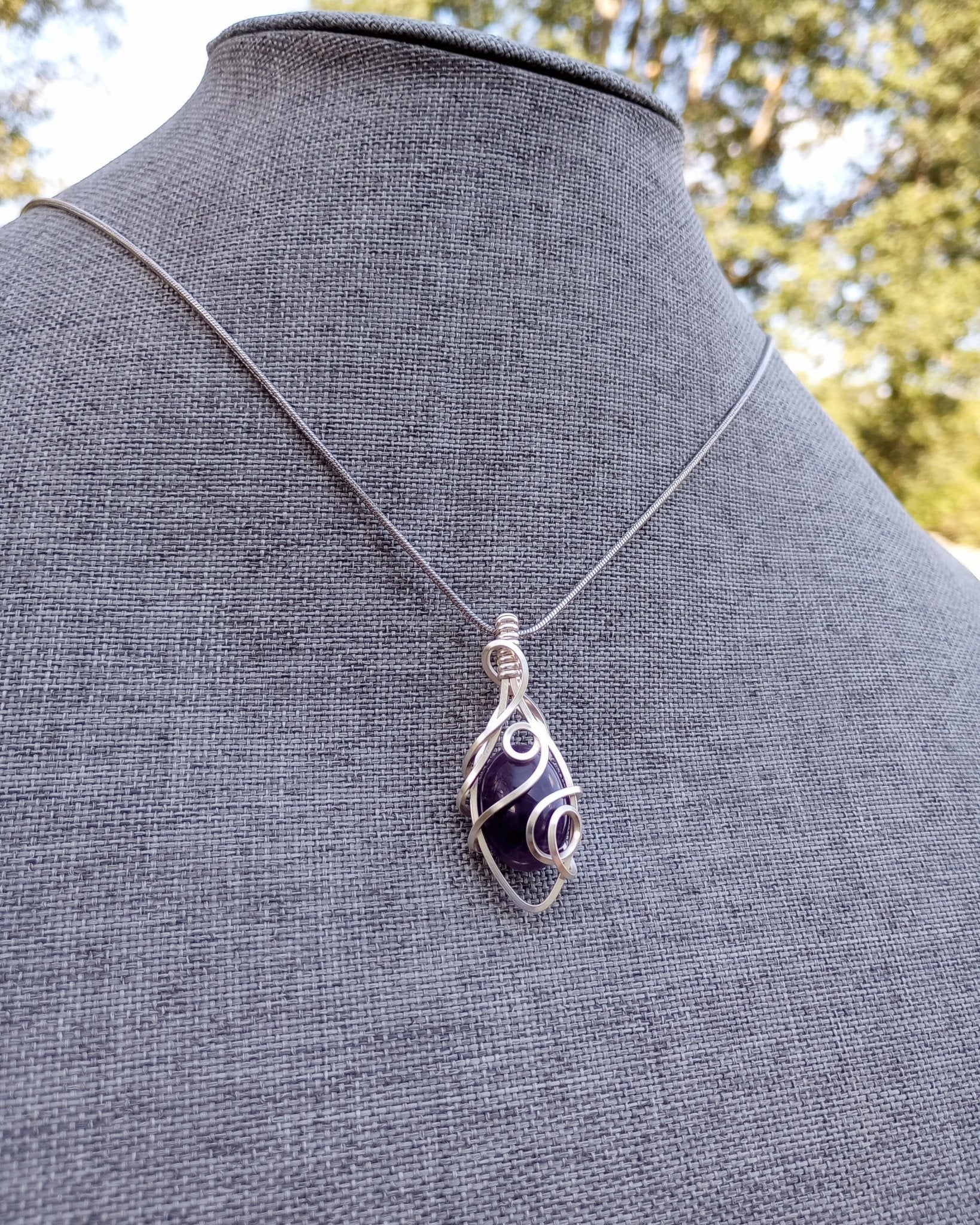 Beautiful purple Amethyst stone wrapped in silver plated swirling wire