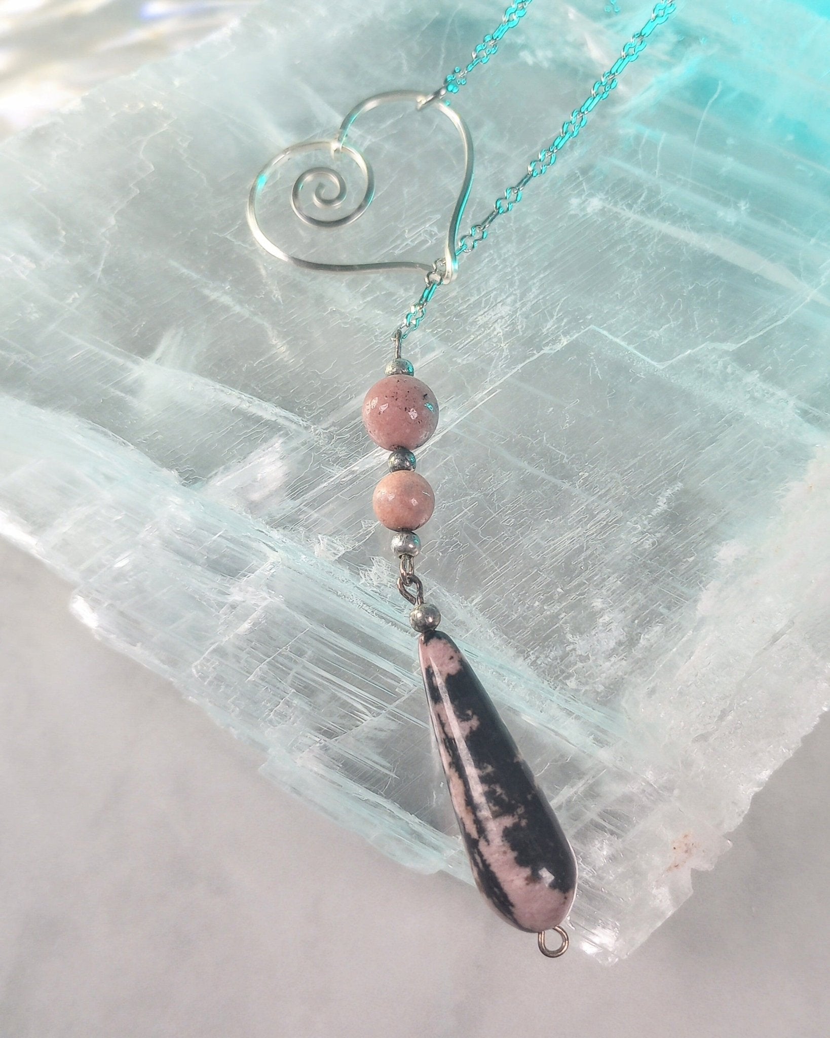 Gorgeous Rhodonite teardrop loops through heart for a unique and lovely statement piece